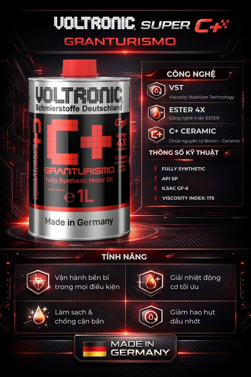 Voltronic Super C+ Granturismo là dầu tổng hợp toàn phần cao cấp dành cho động cơ các dòng xe hơi hiệu suất cao trong ngành đua xe thể thao, với phụ gia Ceramic. Sản phẩm được thiết kế để bảo vệ động cơ trong điều kiện khắc nghiệt nhất.