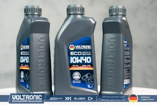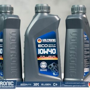 VOLTRONIC ECO MOTO 10W40 là nhớt động cơ chất lượng dành cho xe số, xe côn tay 4 thì hiện đại, được phát triển đặc biệt để mang lại hiệu suất ổn định ngay cả trong điều kiện vận hành khắc nghiệt tại Việt Nam. Đây là sản phẩm thuộc series ECO 4T Edition, ứng dụng công nghệ Special Synthetic Ester độc quyền, kết hợp cùng nguyên liệu dầu gốc và phụ gia 100% được nhập khẩu từ Voltronic GmbH sản xuất tại Đức – thương hiệu danh tiếng đến từ châu Âu, giúp tăng cường khả năng bôi trơn, duy trì độ nhớt ổn định và kiểm soát cặn bẩn hiệu quả.