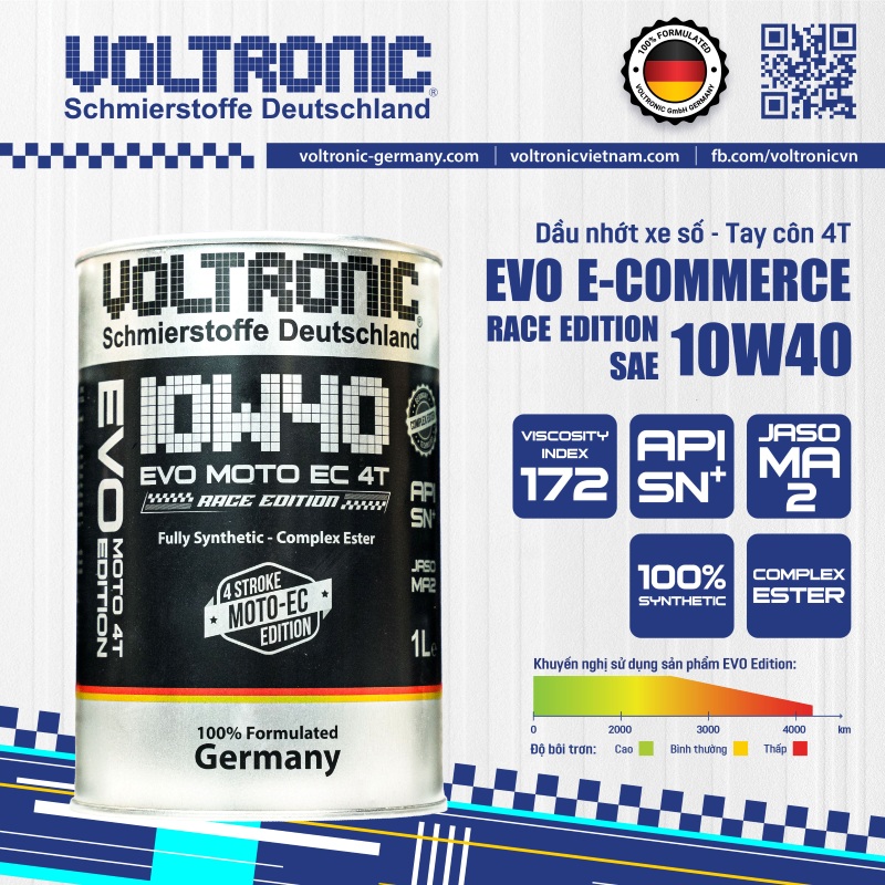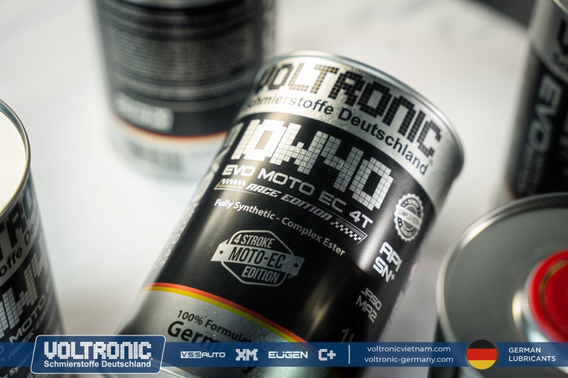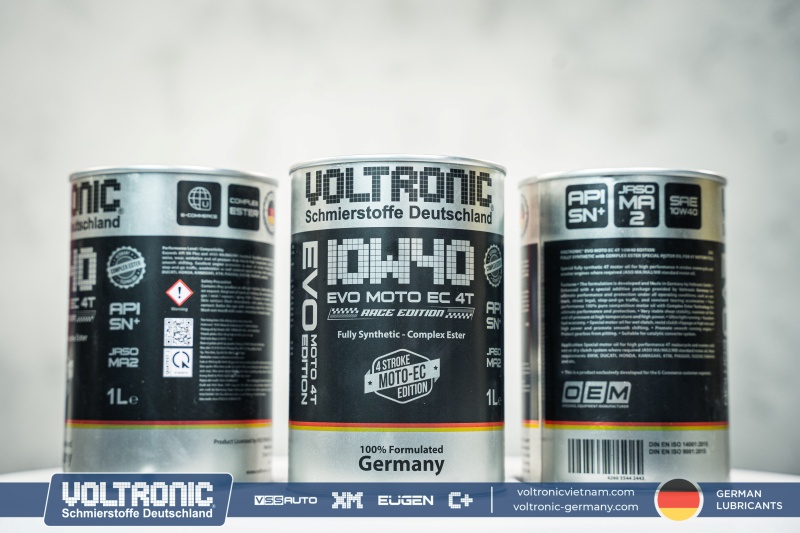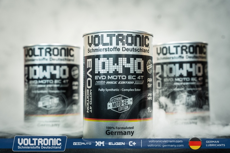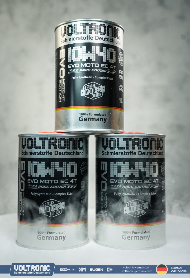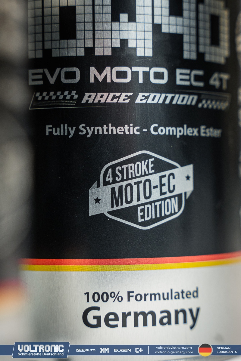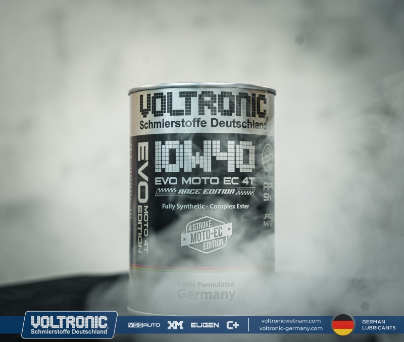 Voltronic EVO Moto EC 10W40 Race Edition – nhớt tổng hợp toàn phần, được thiết kế đặc biệt để sử dụng cho xe máy 4 thì và yêu cầu loại nhớt đạt cấp chất lượng API SN Plus và tiêu chuẩn JASO MA2, kể cả các động cơ có công suất cao hoạt động trong những điều kiện khắc nghiệt.
