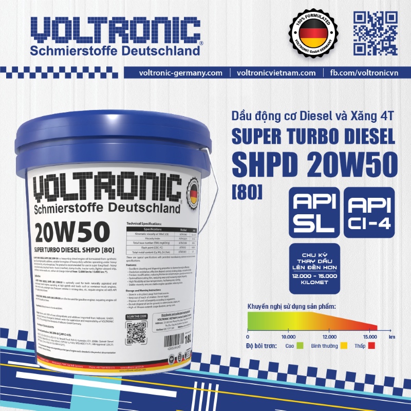 Với thành phần dầu khoáng cao cấp và phụ gia được nhập khẩu 100% từ Đức, Voltronic Super Turbo Diesel SHPD 20W50 [80] được thiết kế đặc biệt cho động cơ dầu diesel được trang bị tăng áp (turbo) giúp chuyến đi trở nên bền bỉ hơn.
