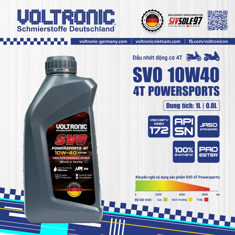 *Voltronic SVO Powersports 10W40 4T Edition là sản phẩm được phân phối độc quyền của SIVSOLE97, được sản xuất bởi Voltronic Việt Nam theo tiêu chuẩn chất lượng và công thức từ Voltronic Germany (Đức).