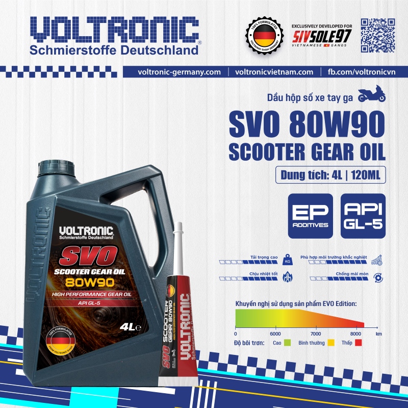 Voltronic SVO Scooter Gear Oil 80W90 được sản xuất từ dầu gốc tinh chế và phụ gia được nhập khẩu từ Voltronic GmbH sản xuất tại Đức.